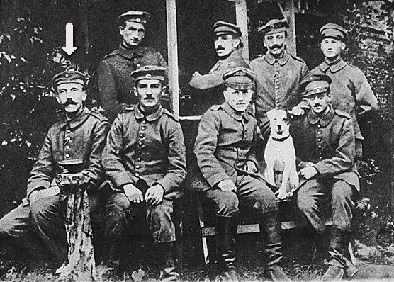 Una rarissima foto di Hitler (indicato dalla freccia) durante la prima guerra mondiale.